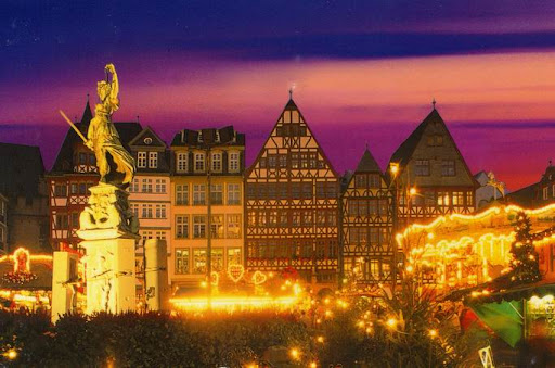 法蘭克福的聖誕市場為德國首屈一指,它是歷史最悠久的聖誕巿場,早於1393年的文獻中已有該市場的正式記載,生於法蘭克福的德國大文豪歌德也是其捧場客。這個聖誕市場發源地不僅歷史悠久,更被譽為最美麗的聖誕市場——Romerberg廣場張燈結綵,中央豎立起30米高的聖誕樹,加上一座座設於廣場上的聖誕小木屋,全場瀰漫佳節氣氛。同時,附近的Nicholas Church會在早午晚三次敲響聖誕鐘聲,而逢星期三及六晚上6時更有傳統樂器演奏。