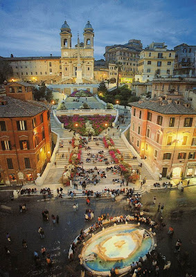 西班牙广场(Piazza di Spagna):位于意大利罗马三一教堂(Trinita dei Monta)所在的山丘下,建筑师为德.桑蒂斯和斯佩基,其以登上教堂的西班牙阶梯而闻名。这座教堂乃1495年查理八世VIII命法国人建造,阶梯共有137阶,名称取自附近的西班牙大使馆,电影“罗马假期”即在此拍摄。阶梯下左侧的墙壁上记载着:1821年诗人济慈于此亡故。阶梯上特有的法国风味设计和广场上的一些英国咖啡馆,呈现出完全不同的气氛。 西班牙广场上的咖啡馆是济慈、拜伦、雪莱等文人最爱去的场所;特别是位于Condotti大街上的Cafe Greco,此为罗马最古老的咖啡馆。Cafe Greco不但为英国诗人聚集之处,各地的艺术家也常在此一展长才,如意大利雕刻家卡诺瓦(Canova)、丹麦雕刻家杜巴森,作家易卜生、戈果里,音乐家萧邦、白辽士、比才、李斯特,此外意大利人所崇拜的大文豪哥德,其名作“塔里夫斯的公主”就是在此完成的。由于附近艺术家云集,通往波波洛广场的Babuino 街也被誉为罗马艺术家气息最浓厚的街道,该街上有许多从事第八艺术的电影演员都在此购屋居住。广场中央有巴洛克式的建筑巨匠贝尼尼所设计的喷水池,是夏日年轻人的避暑胜地。